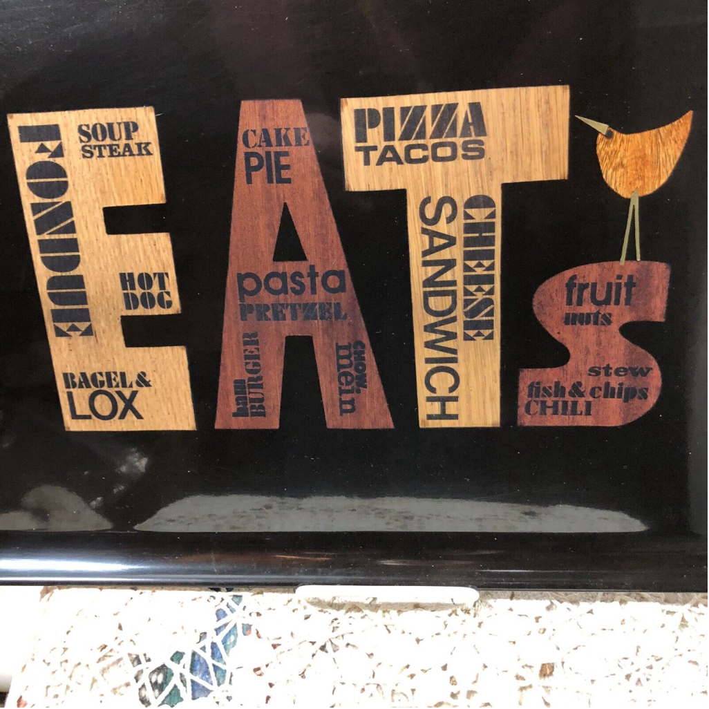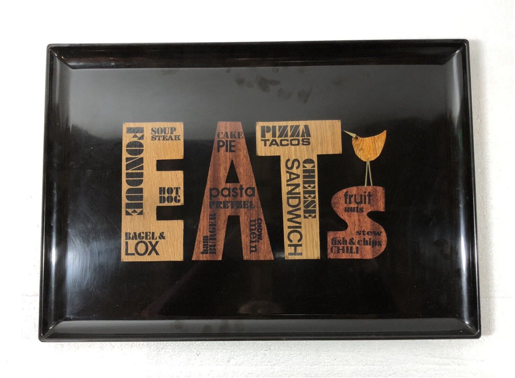 VTG 70’s MCM Couroc Inlaid “EATS”Wood Black Phenolic Tray Snack 18 X 12 Barware.