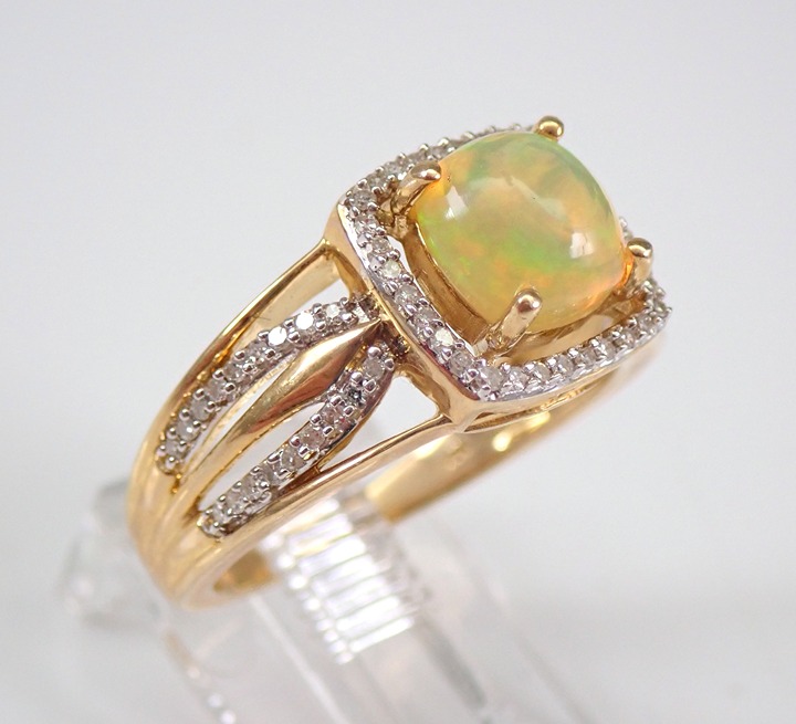 Yellow Gold Diamond and Opal Halo Engagement Ring. This ring is set with one genuine Cushion cut Opal in the center and sixty-eight genuine round brilliant diamonds. This Opal measures 7 X 7 mm and weighs 1 carat. The diamonds in this ring are H color, SI/I in clarity and weigh a total of .25 carat. This ring is 10KT Yellow Gold, weighs 4.1 grams, measures 10 mm in width and is a finger size 7, which can be resized free of charge (please inquire about sizing with the finger size you need). I will ship this ring promptly in a beautiful gift box.